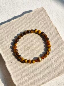 Handgjort med naturlig tigeröga, agat och spessartin (orange granat), erbjuder detta armband en grundande och lugnande energi.