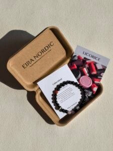 Inspirerat av den bitterljuva harmonin i nordisk lakrits, speglar detta armband skönheten i balans: lugn utan domnad, fokus utan spänning. Precis som lakrits bär på både mjukhet och djup, bjuder detta smycke in sinnet att komma till ro, samtidigt som du förblir närvarande och medveten.