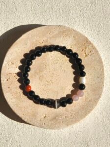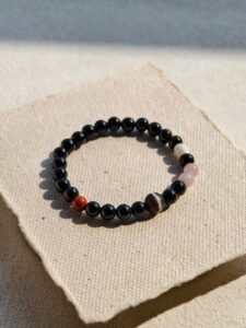 Detta armband är handgjort med naturlig obsidian, agat, röd jaspis, rosenkvarts och vit snäcka, vilket främjar emotionell grundning och inre frid.